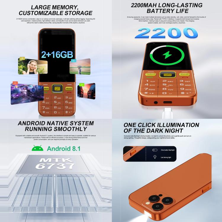 4. Features: Large buttons, one-touch flashlight on the side, BT, WiFi, FM, MP3, MP4, it has Wi-Fi and hotspot capabilities, and supports downloads (however, not all apps compatible with Android 8.1 can be downloaded due to system limitations).