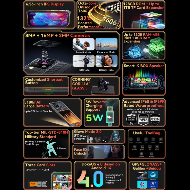 14. Protection: IP68/IP69K/MIL-STD-810H Waterproof Dustproof Shockproof
