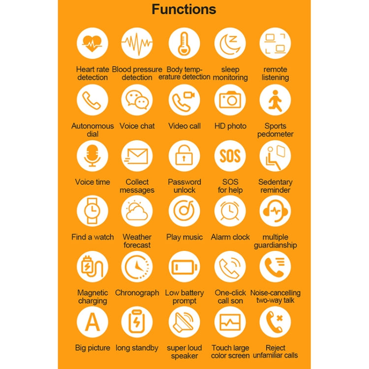 13. Functions: time zone calibration, sleep default manual collection and positioning, fixed upload, low battery alarm, electronic fence alarm, SOS alarm, video call, contacts, dial function, micro chat, heart rate and blood pressure monitoring, body temperature measurement, sleep monitoring , unlock password, take pictures, voice time, step counting, sedentary reminder, weather forecast, refuse to answer calls from strangers, alarm clock, remote shutdown, remote monitoring, historical track, multiple monitoring, firmware upgrade