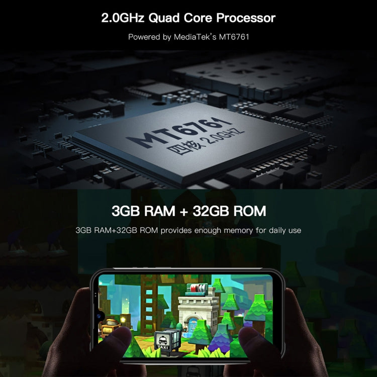 1. MTK6761 quad core cortex-A53 up to 2.0GHz CPU, high performance, combine with 3GB+32GB, run faster and operate more smoothly.